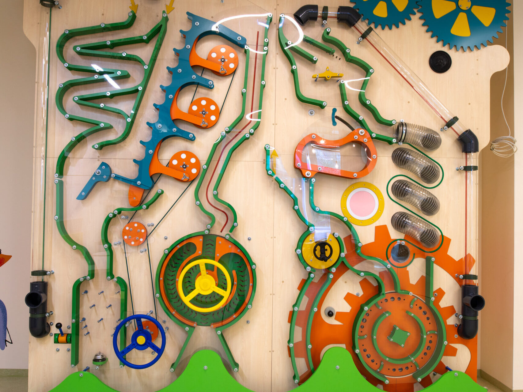 Unsere interaktive und kinetische Wand ist gleichzeitig Spielattraktion und spannendes Wissenschafts-Exponat. Mit Hilfe von mechanischen und elektrischen Elementen können Kinder Kugeln bewegen und beobachten, wie sie über die Wand rollen. Je nachdem, mit welcher Kraft und in welche Richtung die Kinder die Kugel schicken, bestimmen sie selbst die Bahn ihrer Rückkehr.