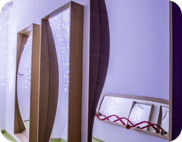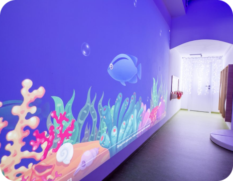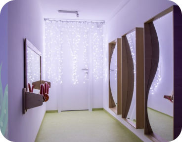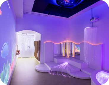In unserem liebevoll eingerichteten Snoezelen-Raum tauchen Kinder in eine traumhafte Atmosphäre aus Licht, Klang und Projektionen ein. Auf weichen Matten liegend, erleben sie – im abgedunkelten Raum – leuchtende Sterne, aufgehende Sonnen, schwimmende Fische oder ein Blütenmeer an den Wänden. So entsteht eine sanfte Fantasiereise, die alle Sinne berührt.